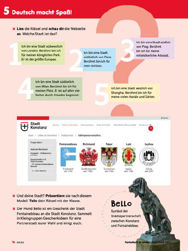 Sur une page du manuel, le jumelage Constance-Fontainebleau sera évoqué et le présent que notre Ville avait fait à Constance, le chien Bello, réplique d’un chien de la fontaine de Diane au château, exposé dans la cour de la mairie de Constance, y figurera en bonne place.