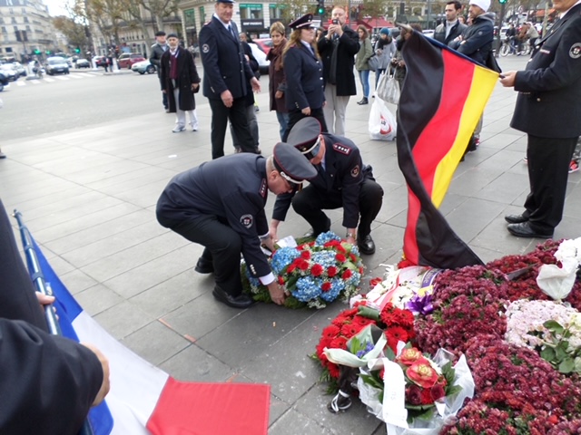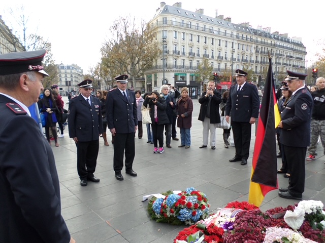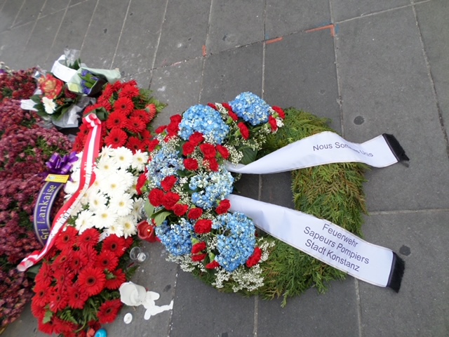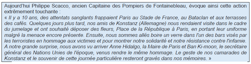 Nous avons appris qu’il y a 10 ans, au moment de la tragédie du Bataclan, les pompiers de Constance, qui étaient venus rendre visite à leurs amis pompiers de Fontainebleau, se sont rendus Place de la République pour déposer une gerbe de fleurs, en mémoire des morts.
